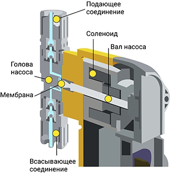 PTFE не разрушается под воздействием кислот, щелочей и дезинфицирующих средств. Срок службы тефлоновой мембраны превышает 5 лет непрерывной работы. Съемная рабочая головка позволяет быстро заменить мембрану насоса, не разбирая изделие.